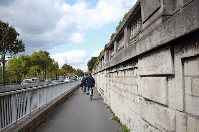 - When we arrived to Paris, it was drizzling. We had a few hours to kill before we could check in to our little apartment, so we stashed our bags in "city lockers" (for real - one day rentals), checked out some bikes we'd previous rented and made our way down the Champs-Elysees to the Arc de Triompe. Shit you not, the first thing we do is bike a congested street in a foreign city in the rain. Fun times.